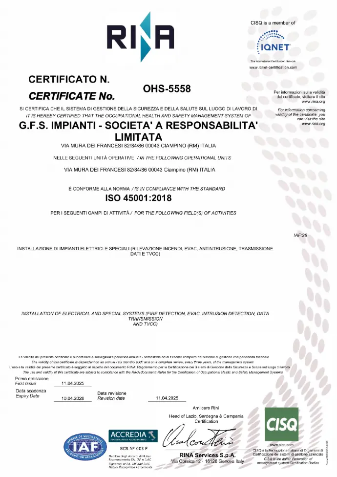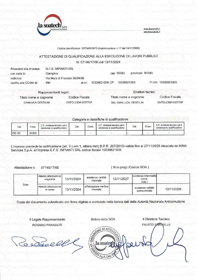 L'attestazione SOA categoria OS30 (fornitura, montaggio e manutenzione impianti elettrici, telefonici, radiotelevisivi, di trasmissione dati e simili) classe III-BIS (gare d'appalto per opere pubbliche con un valore a base d'asta fino a 1.500.000€) è il documento che qualifica GFS IMPIANTI come partner privilegiato e competente per l'esecuzione di opere specialistiche, aggiungendo un livello di garanzia legale e tecnica alle certificazioni di Qualità (ISO 9001) e Sicurezza (ISO 45001).