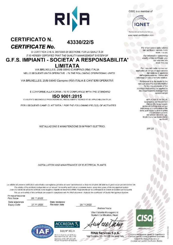 La certificazione ISO 9001:2015 non è per GFS IMPIANTI un semplice attestato, ma la manifestazione concreta del nostro modello operativo, interamente focalizzato sulla qualità e sulla costante soddisfazione delle aspettative del cliente.